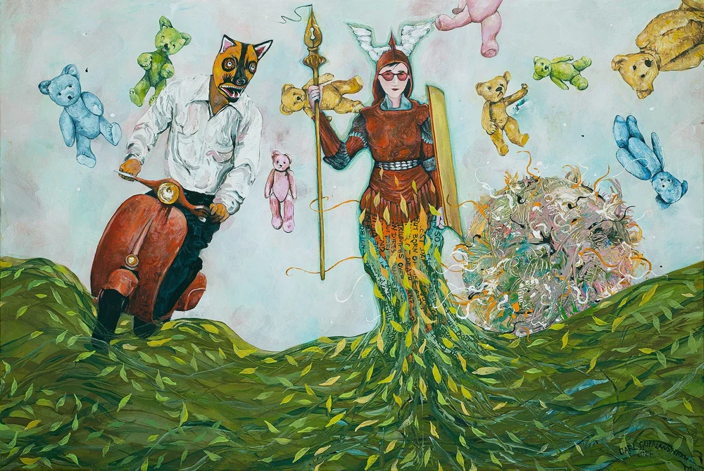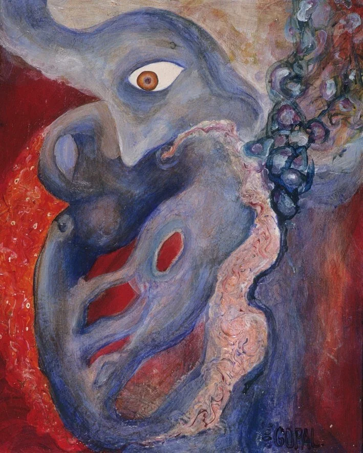 In his studio notes, Gopalkrishnan often returns to the idea of crossing… between cultures, between genders, between sacred and profane imagery. His work Gaza Trilogy (2024–) begins from scenes of war and displacement, combining “religious ancient prophecy, symbols from ancient amulets and cultural artifacts such as the golliwog doll.” The canvases weave fragments of iconography and trauma. They ask how inherited symbols of holiness might speak again after violence.